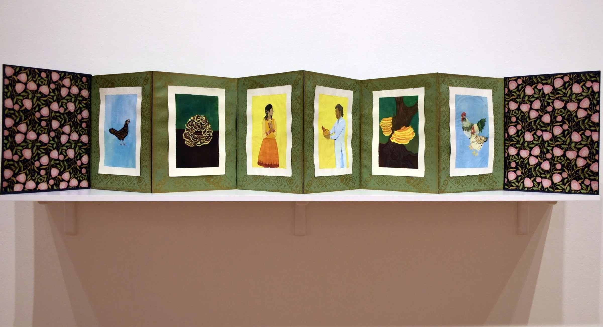 Chickens and Hens (2022). Accordion book with gouache and collagraph. 15” x 72” Display size.